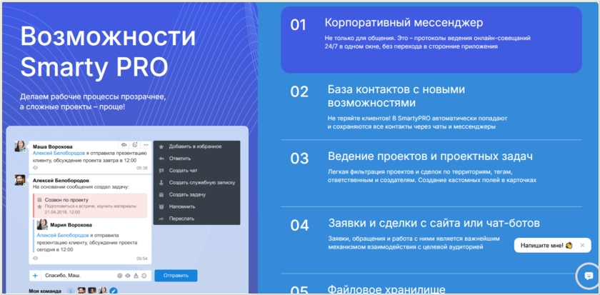 Нижегородская компания Облачные технологии произвела небольшой ребрендинг своей системы Smarty CRM - теперь она называется SmartyPRO и позиционируется как единое рабочее пространство для удалённого, эффективного управления бизнесом. Это система для работы в «одном окне» не только с клиентами, но и с собственным корпоративным мессенджером, задачами, проектами, файлами, обсуждениями. В SmartyPRO автоматически попадают и сохраняются все контакты через чаты и мессенджеры. Заявки и сделки с сайта или чат-ботов - обрабатываются с помощью внутреннего таск-трекера. Наличие API позволяет формировать заявки из других информационных систем. Особенно компания фокусирует внимание на конструкторе чат-ботов, которые автоматизируют коммуникаций с клиентами. Стоимость сейчас начинается от 399 ₽/мес за пользователя в месяц.