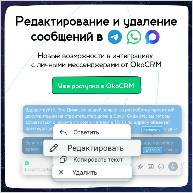 В обновлении OkoCRM появилась возможность редактировать и удалять сообщения в Чатах с клиентами в мессенджерах WhatsApp, Telegram, Max. Чтобы не путаться в истории переписки, такие сообщения помечаются аккуратными плашками «изменено» и «удалено». Также, реализованы системные уведомления в Максе на случай, если Telegram вдруг будет нестабилен. Появилось новое правило автоматизации «Закрыть все диалоги». Если в сделке с клиентом есть открытый диалог, новый робот не может запустить новый чат. Чтобы робот заново запускался, диалоги каждый раз нужно было проходиться и закрывать вручную в чатах. Теперь такое можно автоматизировать.