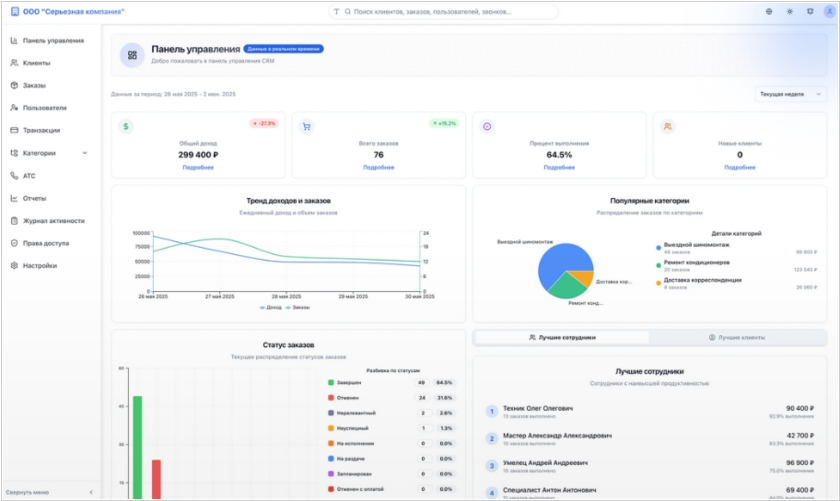 AstraCRM - комплексное CRM-решение, разработанное для сервисных компаний для эффективного управления клиентами, техниками и операциями. В системе есть удобный список заказов с статусами, приоритетами и историей изменений, база клиентов с контактами, адресами и историей обращений, учет сотрудников и исполнителей: кто чем занимается, сколько заработал и сколько заказов в работе, финансы - автоматический расчёт стоимости, доходов, процентов и прибыли, отчёты и аналитика, чтобы видеть, где бизнес зарабатывает, а где теряет деньги. Исполнители работают через мобильное приложение: принимают заказы, строят маршрут, отчитываются о выполненной работе. Руководитель видит всю картину бизнеса в реальном времени - без таблиц, хаоса и ручных подсчётов. Есть бесплатная версия для команд до 5 пользоватей, а платная начинается от 3360 руб/месяц.